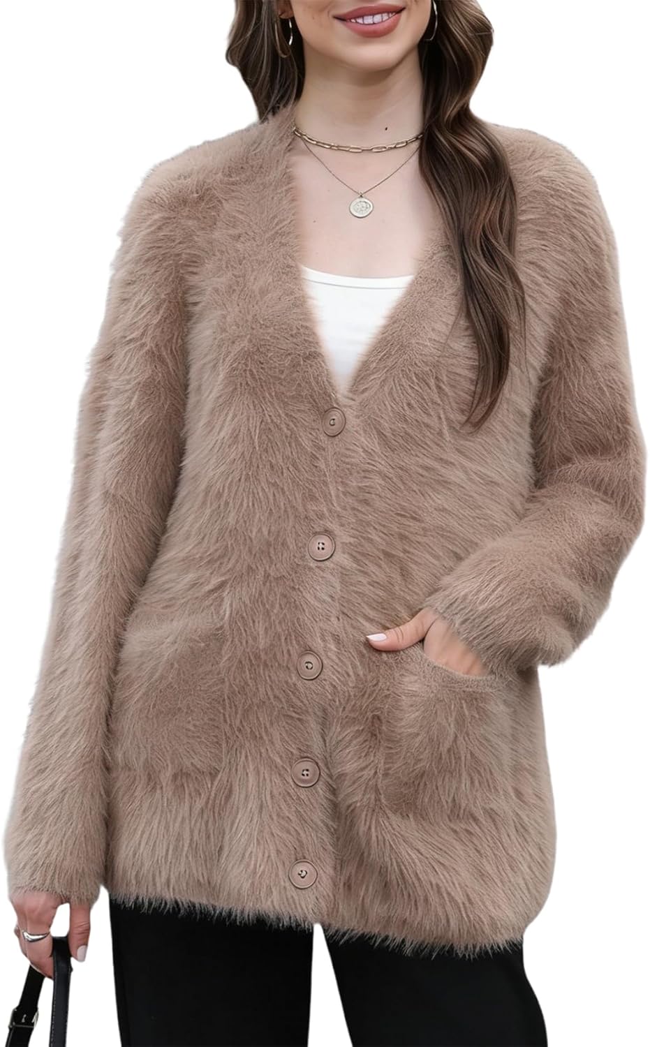 Wyeysyt Women's Fuzzy Cardigan Sweater V Neck Long Sleeve Button Down Knit Furry Sweaters with Pockets