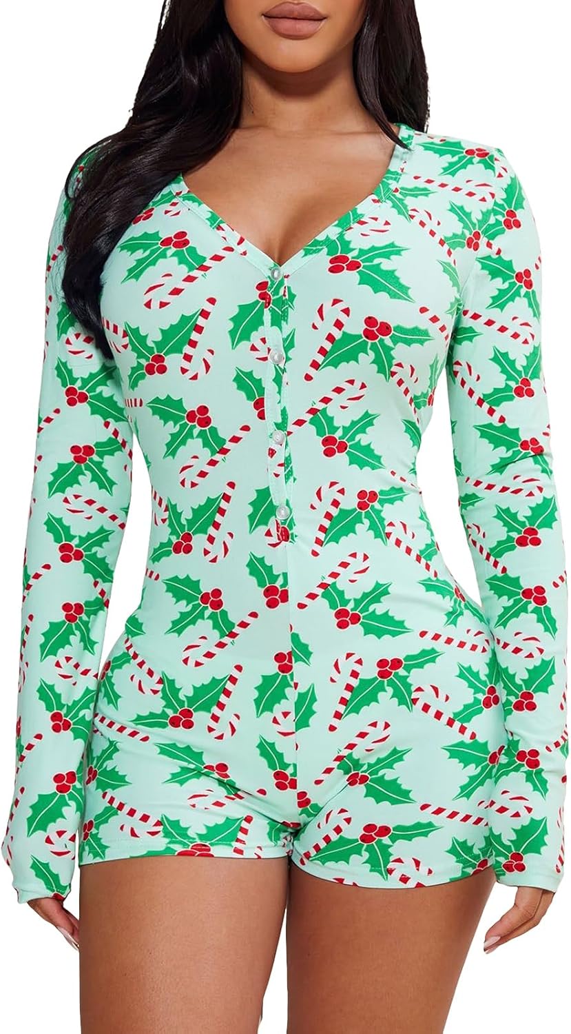 Women Christmas Pajama Onesie Long Sleeve V-Neck Bodycon Romper One-Piece Jumpsuit Shorts Holiday Outfit