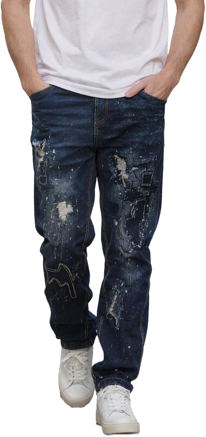 Men's Slim Fit Stretch Printed Jeans Patchwork Skinny Straight Denim Pants