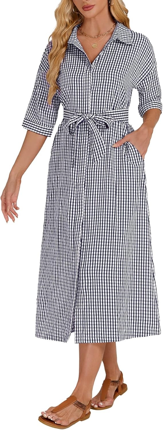Women's Half Sleeve Plaid Maxi Dress 2026 Spring Summer Gingham Casual Button Down Long Loose Belted Dress
