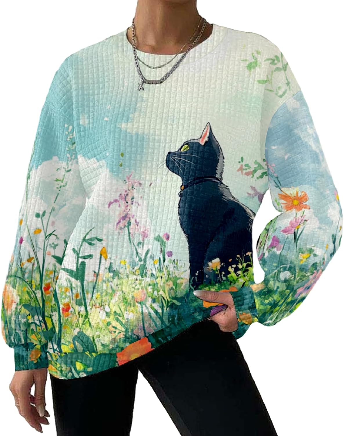 Waffle Sweatshirt Women Cute Funny Long Sleeve Crew Neck Fall Sweatshirts Cat Graphic Pullover Trendy Outfits