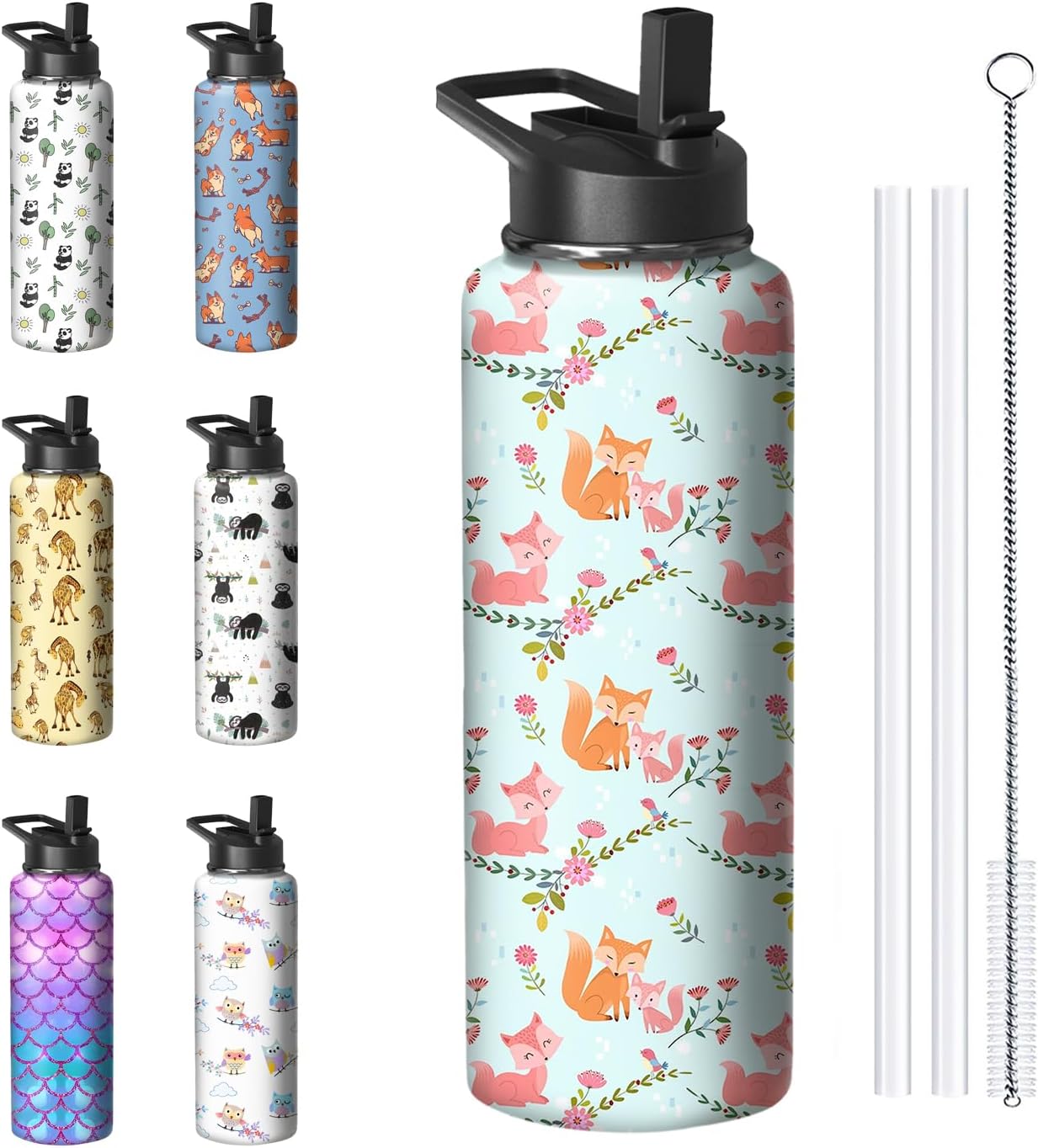 40oz Fox Water Bottle with Handle and Flip Straw, Sports Stainless Steel Insulated Cup Travel Coffee Mug Tumbler, Birthday Mothers Day Chritmas Gifts for Women