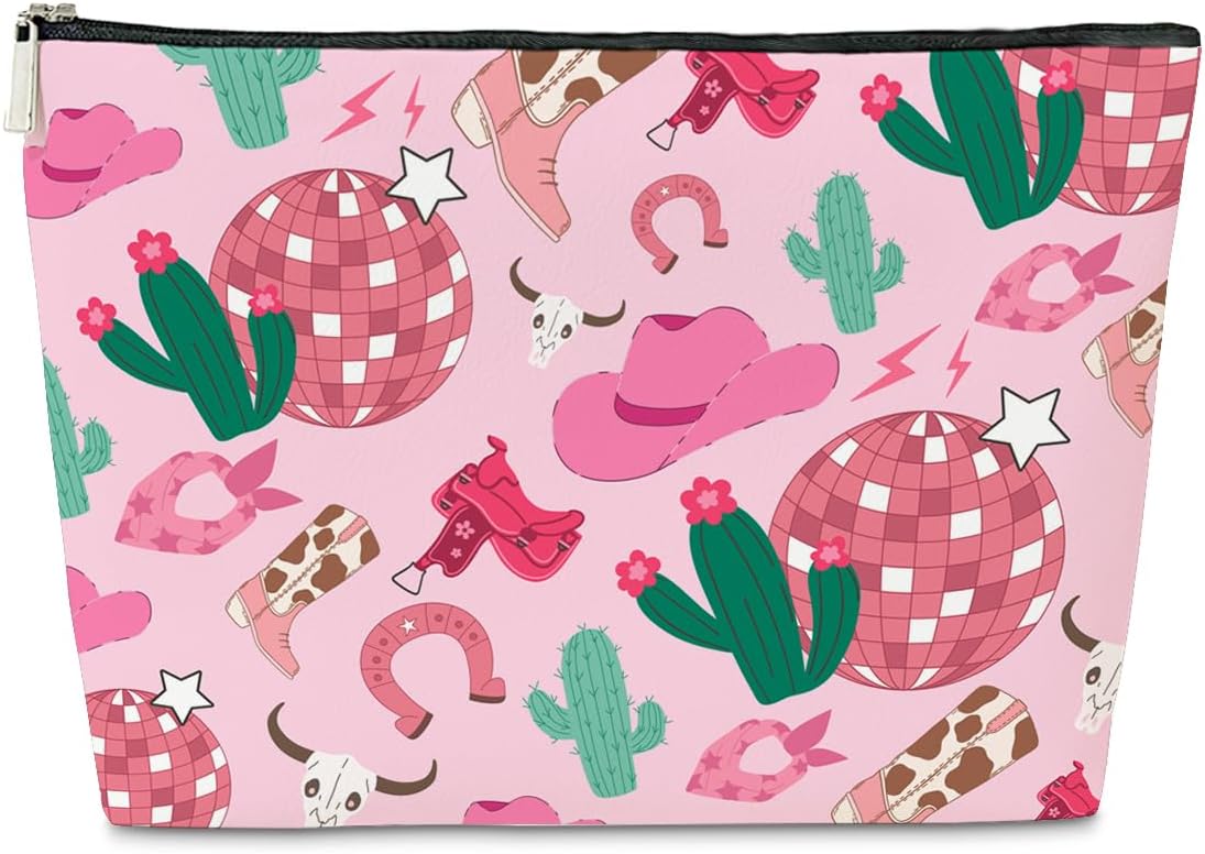 JioJio Chan Cowgirl Makeup Bag, Coquette Pink Disco PU Leather Makeup Cosmetic Bag for Purse, Western Gifts for Women, Western Cowgirl Stuff for Women, Country Girl Gifts Pouch