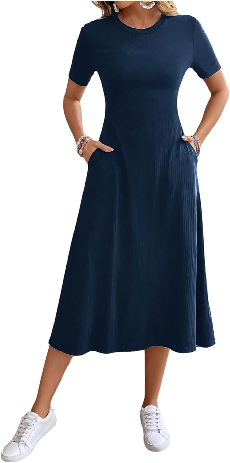OYOANGLE Women's Short Sleeve Crewneck Midi Dress Ribbed Knit Long Dresses with Pockets