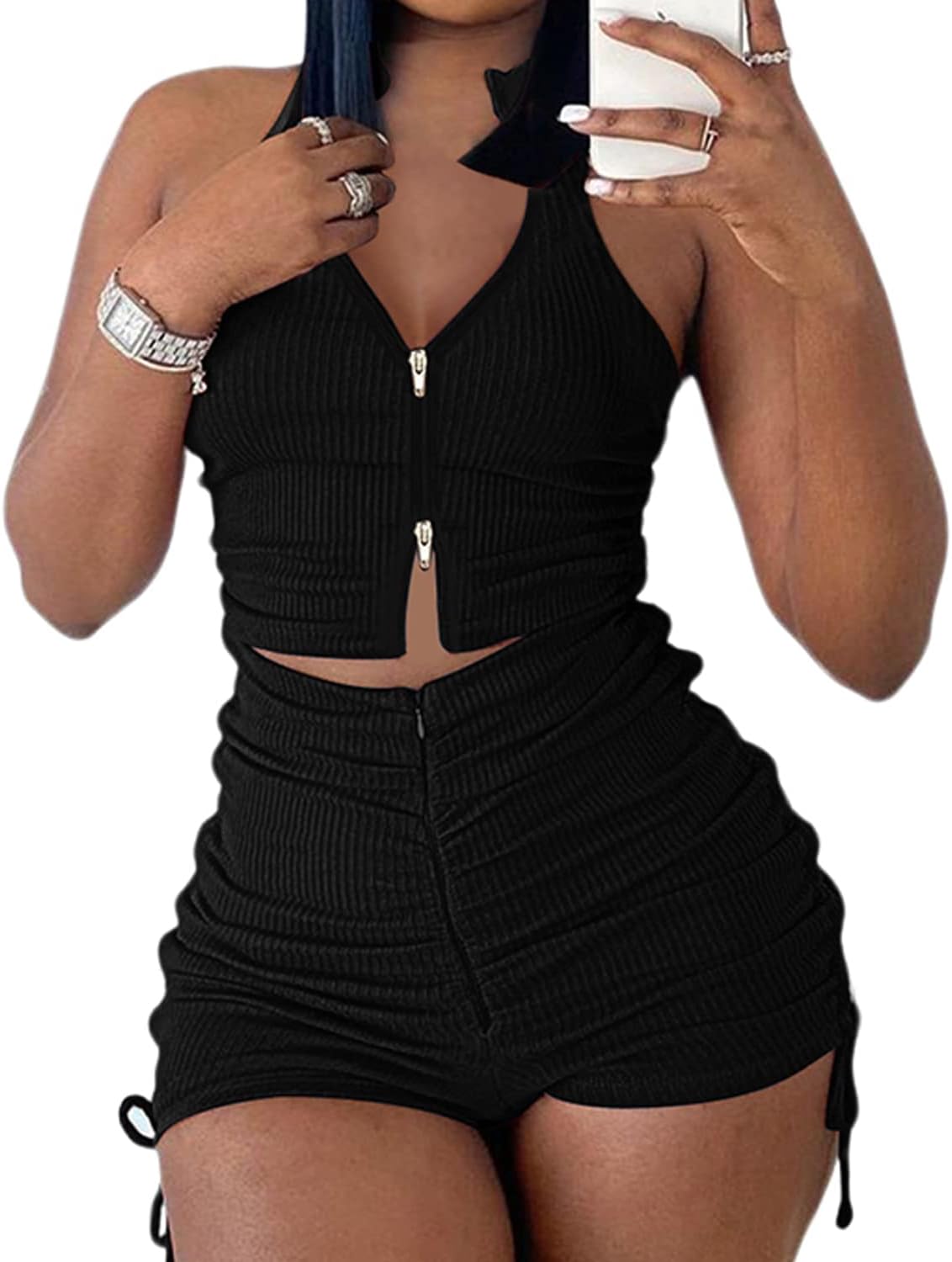 PYAEAS Summer Two Piece Outfits for Women, Casual Stretchy Ribbed Tank Crop Top Ruched Shorts Set Workout Tracksuits