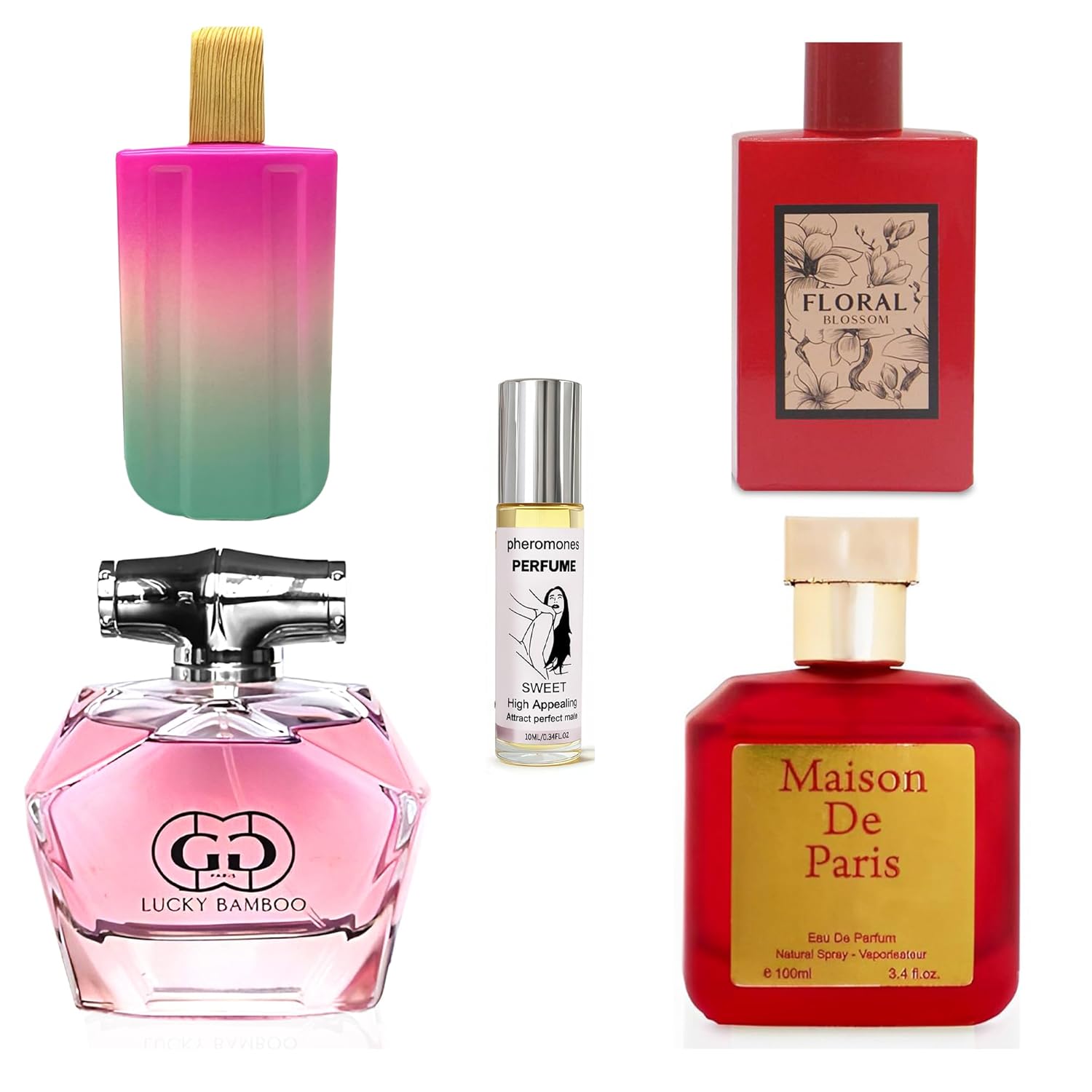 4-Piece Women's Perfume Set with 10ml Rollerball, EDP Collection, Variety of Fragrances,Long Lasting Fragrance (JASMINE/Maison de Paris RED/LUCKY BAMBOO/Floral Blossom)