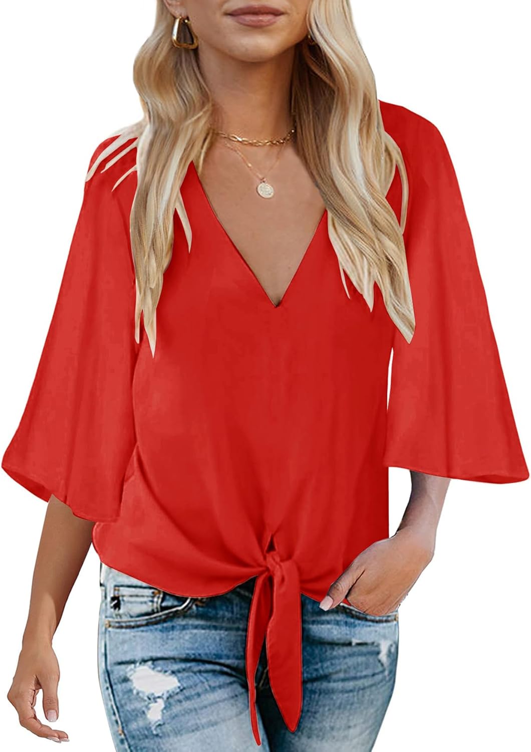 Bluetime Womens Tie Front Tops 3/4 Bell Sleeve V Neck Cute Summer Tops Shirts Casual Chiffon Blouses