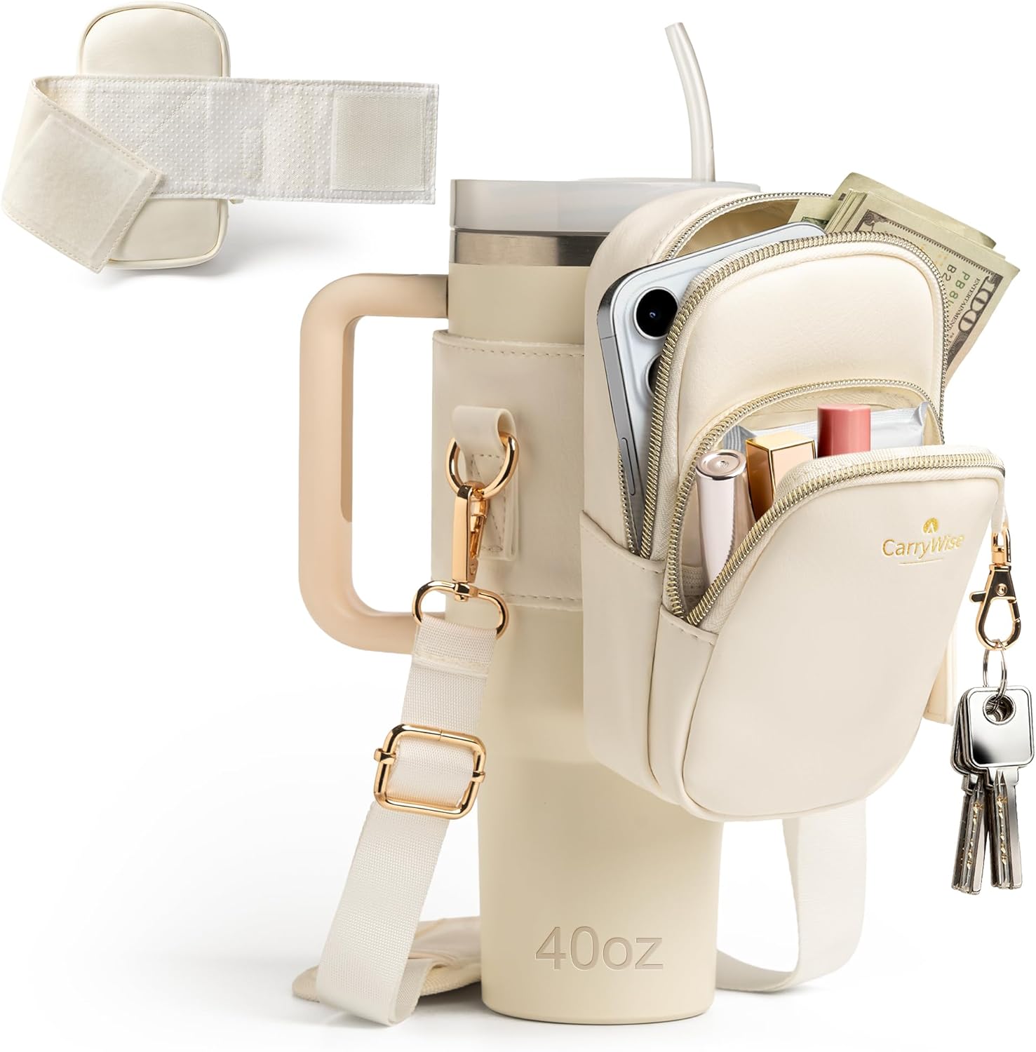 - Simplicity & Practicality: This Stanley water bottle accessory kit has two main pockets, each with a partitioned pocket inside. The large pocket can easily hold a phone and also accommodate tissues, wipes, headphones, lipstick, etc. The small pocket can hold keys, cash, credit cards, etc. There is no need to carry a large backpack for these small items.