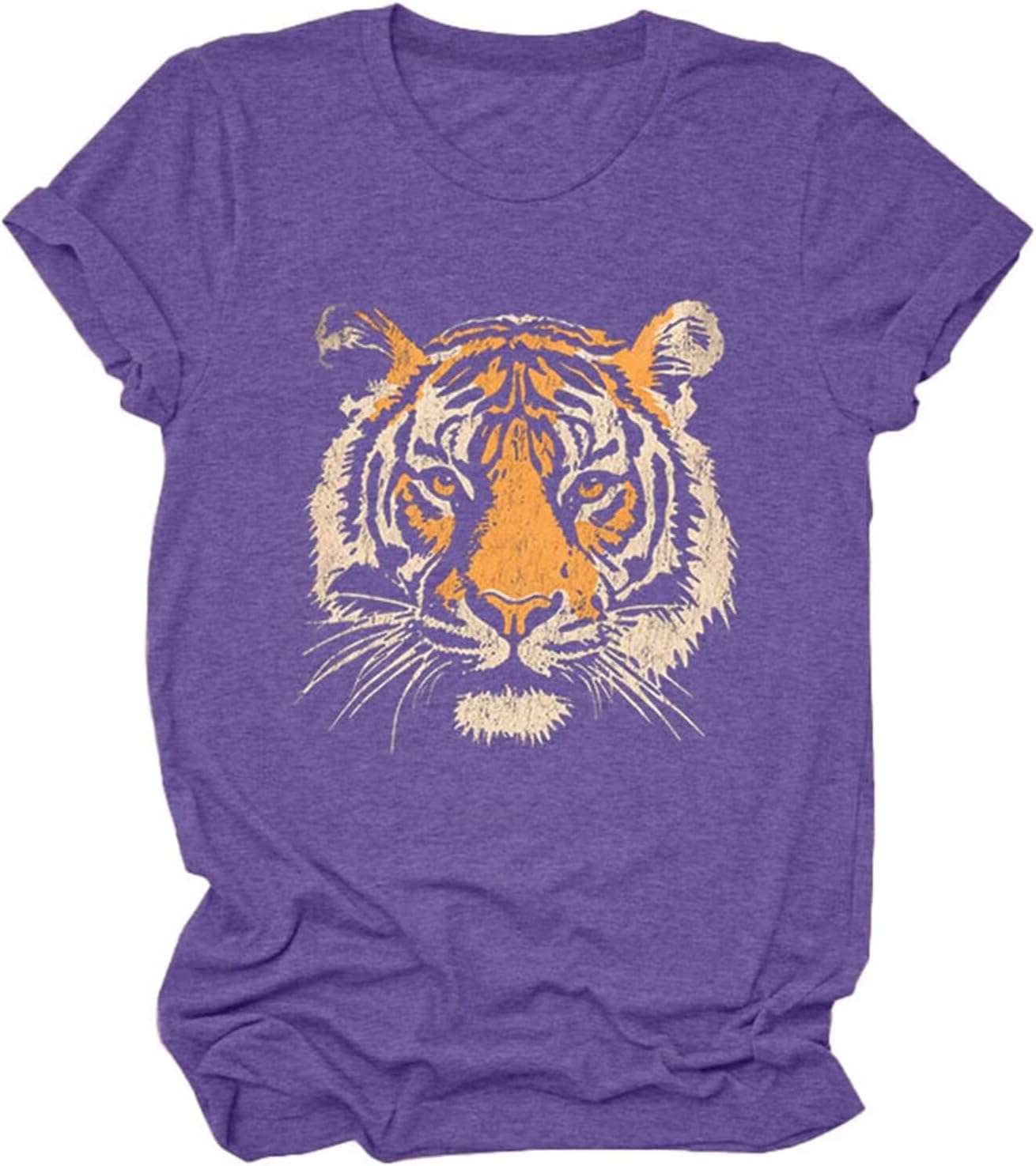 Tiger Printed T-Shirt Women Cute Animal Tiger Face Graphic Novelty Casual Comfort Crewneck Short Sleeve Tops