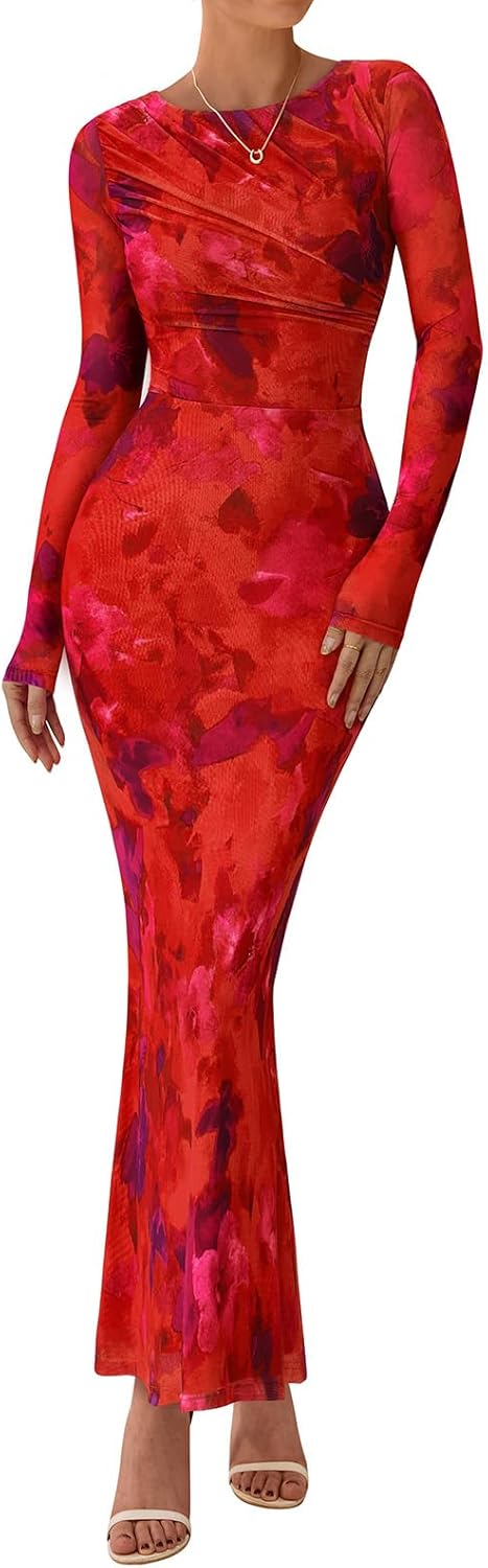PRETTYGARDEN Women's Long Sleeve Floral Fall Wedding Guest Dress Casual Crewneck Ruched Bodycon Mesh Long Maxi Dresses