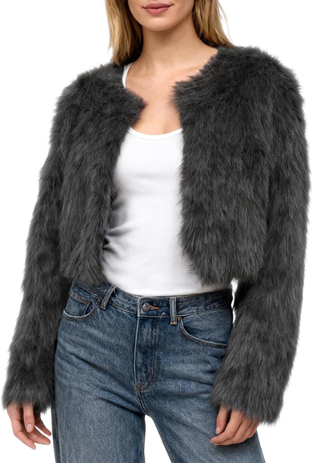 Amazhiyu Women's Faux Fur Cropped Coat Pockets Long Sleeve Open Front Winter Jacket