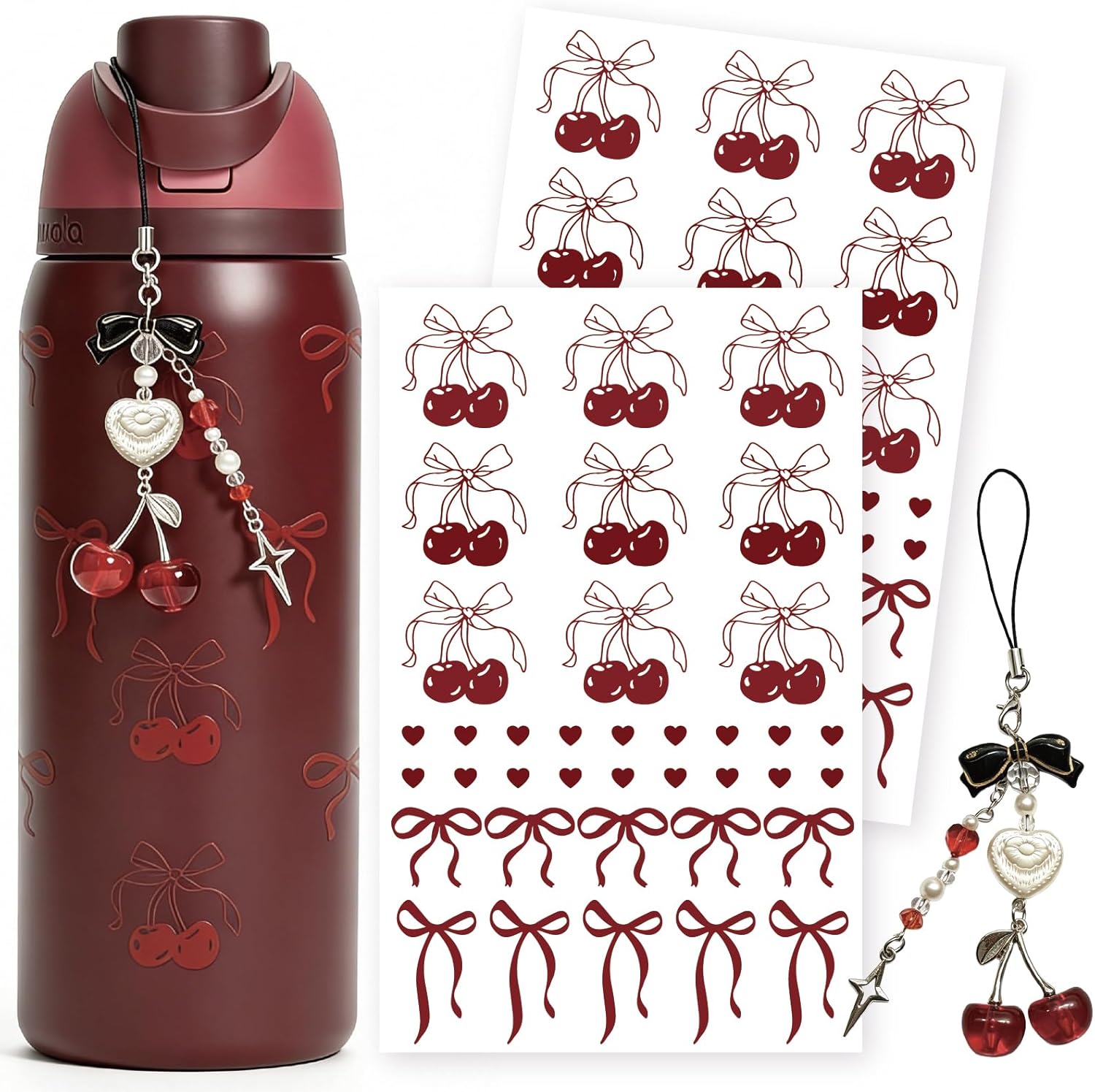 - AESTHETIC UPGRADE: Trendy accessories for Cherry & Coquette lovers! Features 2 UV DTF sheets (4.5"x7.5") with cherry/bow/heart designs plus a pearl cherry charm. Custom-fit for Black Cherry Owala and Stanley 40oz