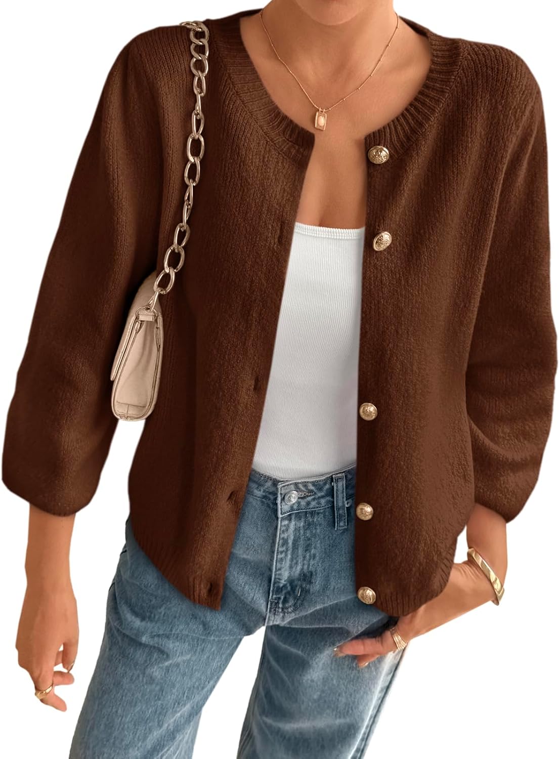 Cicy Bell Womens 3/4 Puff Sleeve Cardigan Sweater Fall Trendy Casual Button Up Loose Fit Cropped Knit Sweaters
