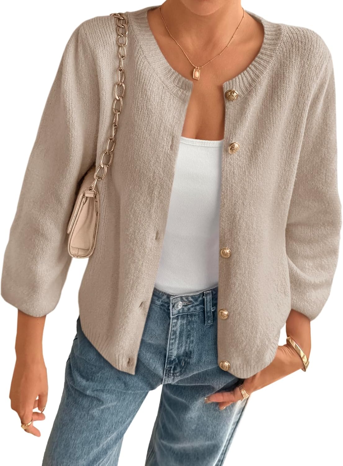 Cicy Bell Womens 3/4 Puff Sleeve Cardigan Sweater Fall Trendy Casual Button Up Loose Fit Cropped Knit Sweaters Khaki