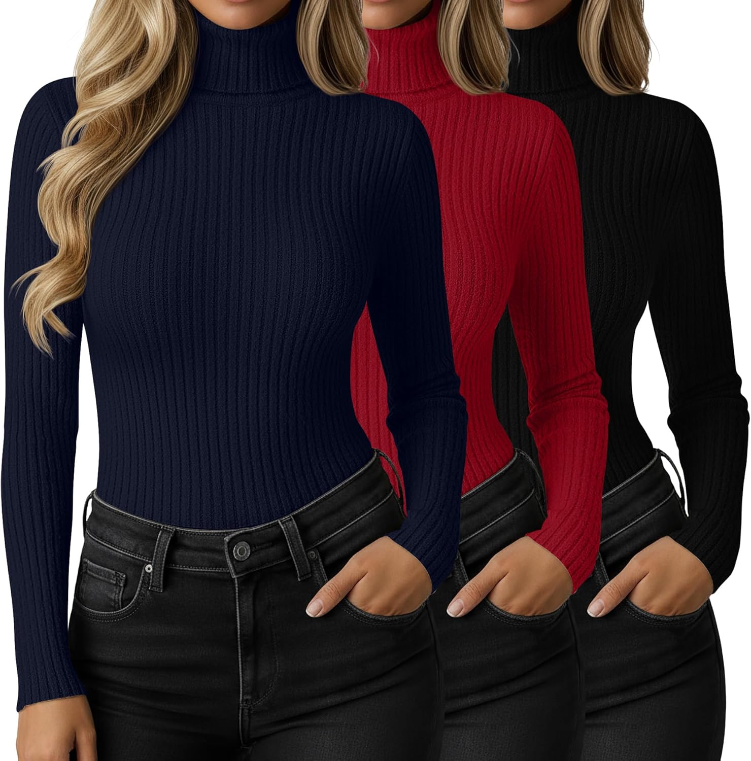 3 Pack Womens Turtleneck Sweaters, Knit Long Sleeve Ribbed Fitted Shirts Casual Warm Pullover Top Basic Fall Sweater
