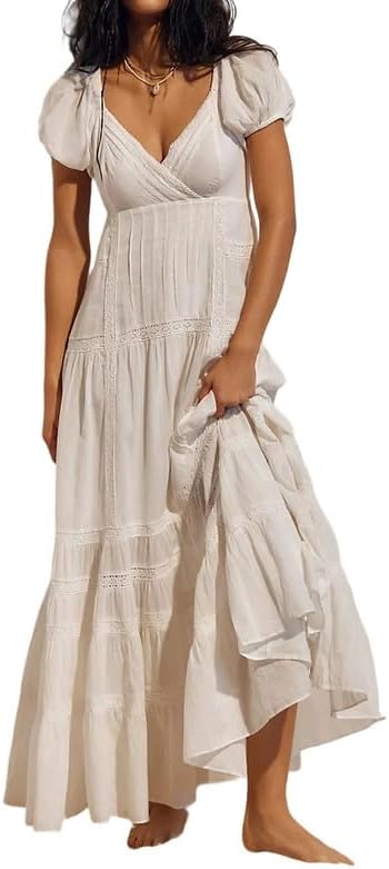 Woman Floral Puff Sleeve Maxi Dress Square Neck Ruffle Flowy Long Dresses Bohemian Tiered Summer Sundress