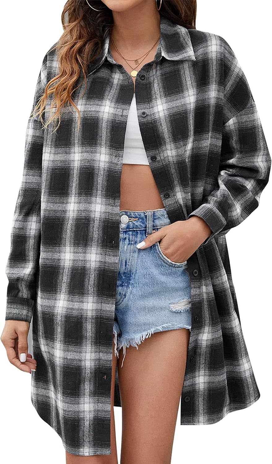 Zontroldy Womens Button Down Flannel Plaid Shirts Mid Long Casual Boyfriend Buffalo Pockets Shirt Jacket Shacket Coat
