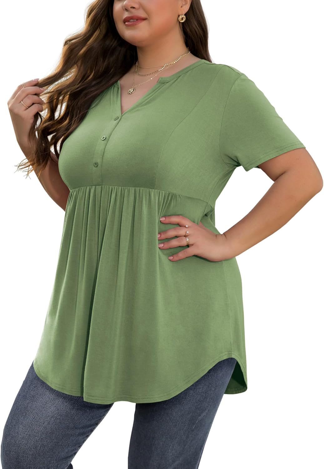 SHIJIALI Women's Plus Size Henley Shirts V Neck Button Tunic Tops Casual Short Sleeve Swing Flowy Tunic