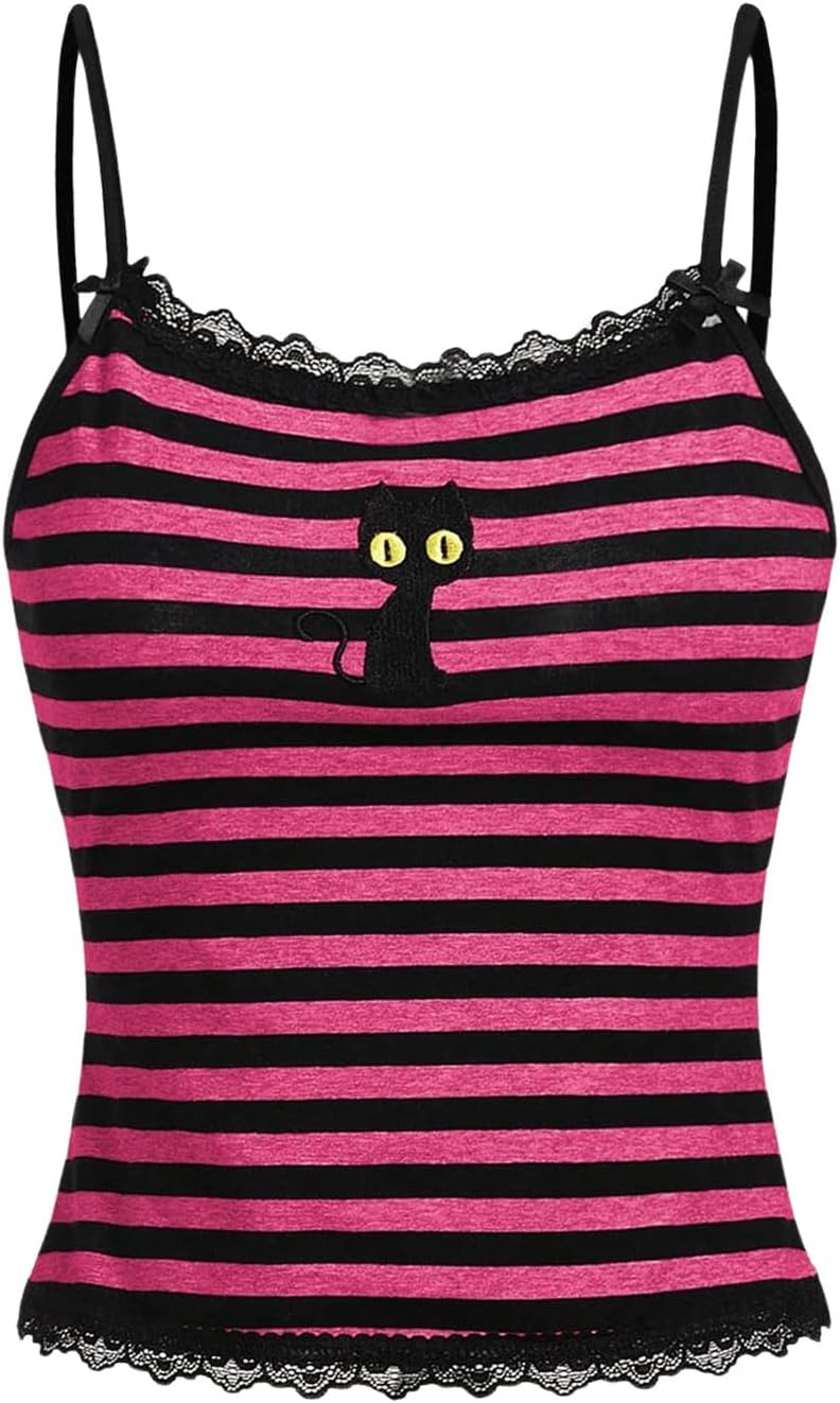 Floerns Women's Sleeveless Cat Embroidery Striped Scoop Neck Contrast Lace Cami Tops