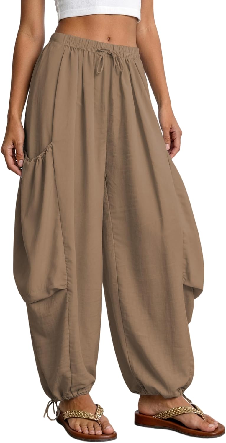 Womens Linen Wide Leg Pants with Drawstring Beach Boho Palazzo Harem Pants with Pockets Baggy Loose Pants for Women