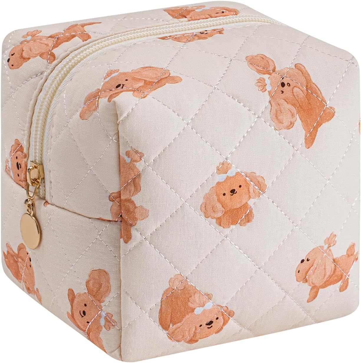 Cube Cosmetic Makeup Bag Small Cotton Quilted Makeup Pouch for Purse Cute Floral Travel Toiletry Zipper Pouch (Dog)