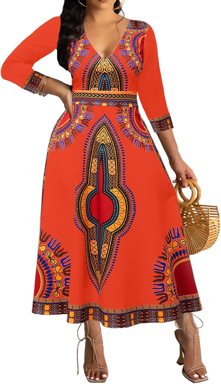 African Dresses for Women Elegant V Neck 3/4 Sleeve Casual Long Maxi African Attire Dress