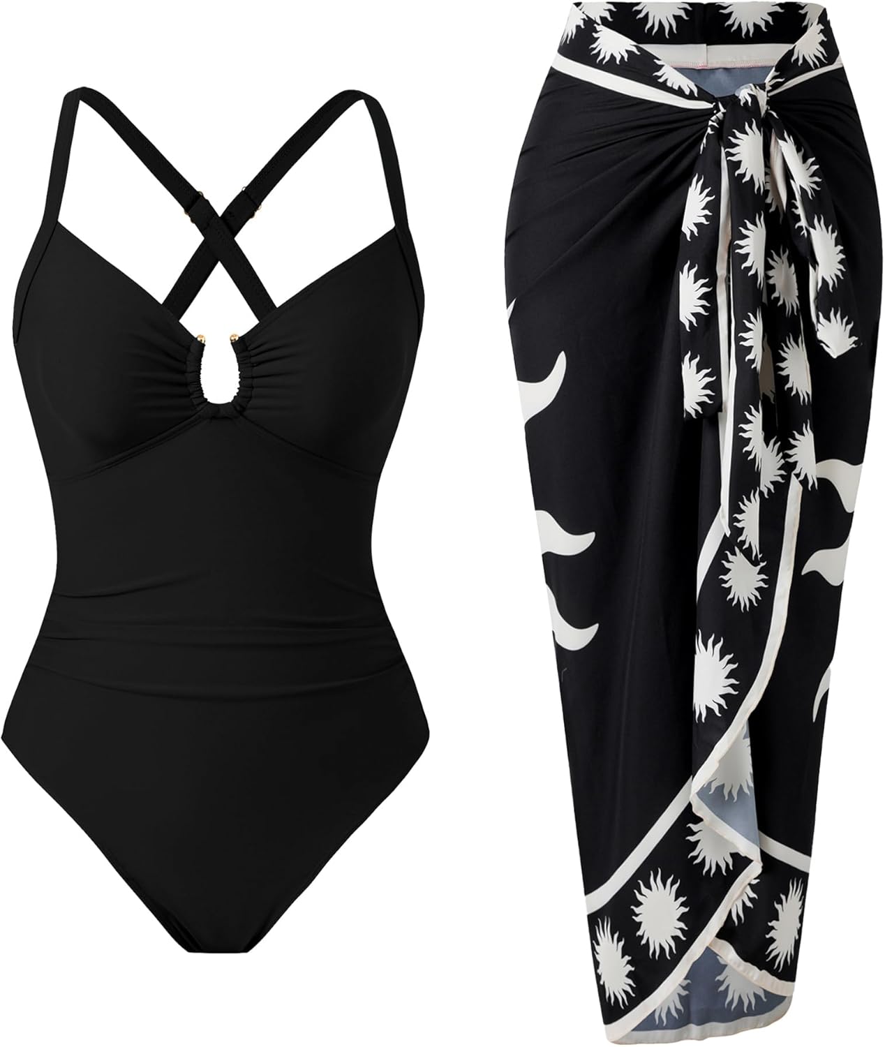 Women’s Tummy Control One Piece Swimsuit Set with Skirt Wrap Cover Up Retro Bathing Suit