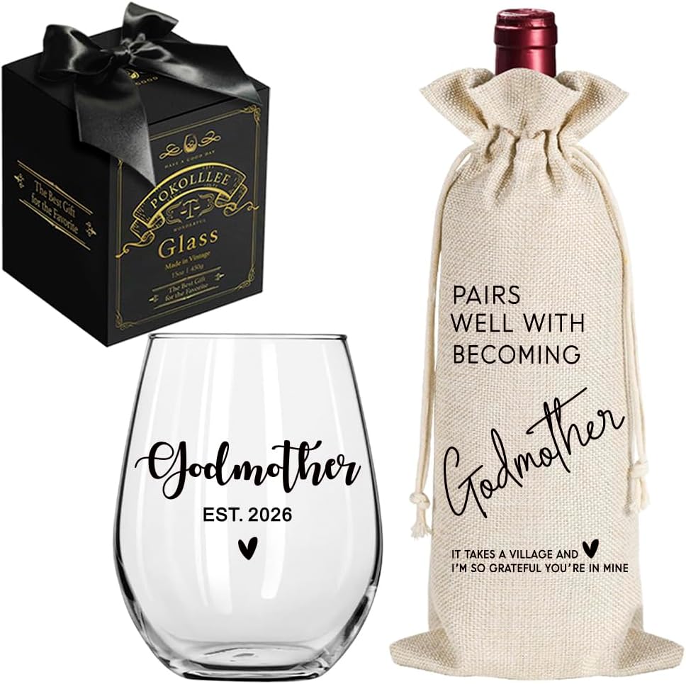 EST 2026 New Godmother Wine Glass First Time Godmother Gifts, Godmom to Be Pregnancy Announcement Wine Bag, Novelty Baptism Wine Glass Gift for Godmom