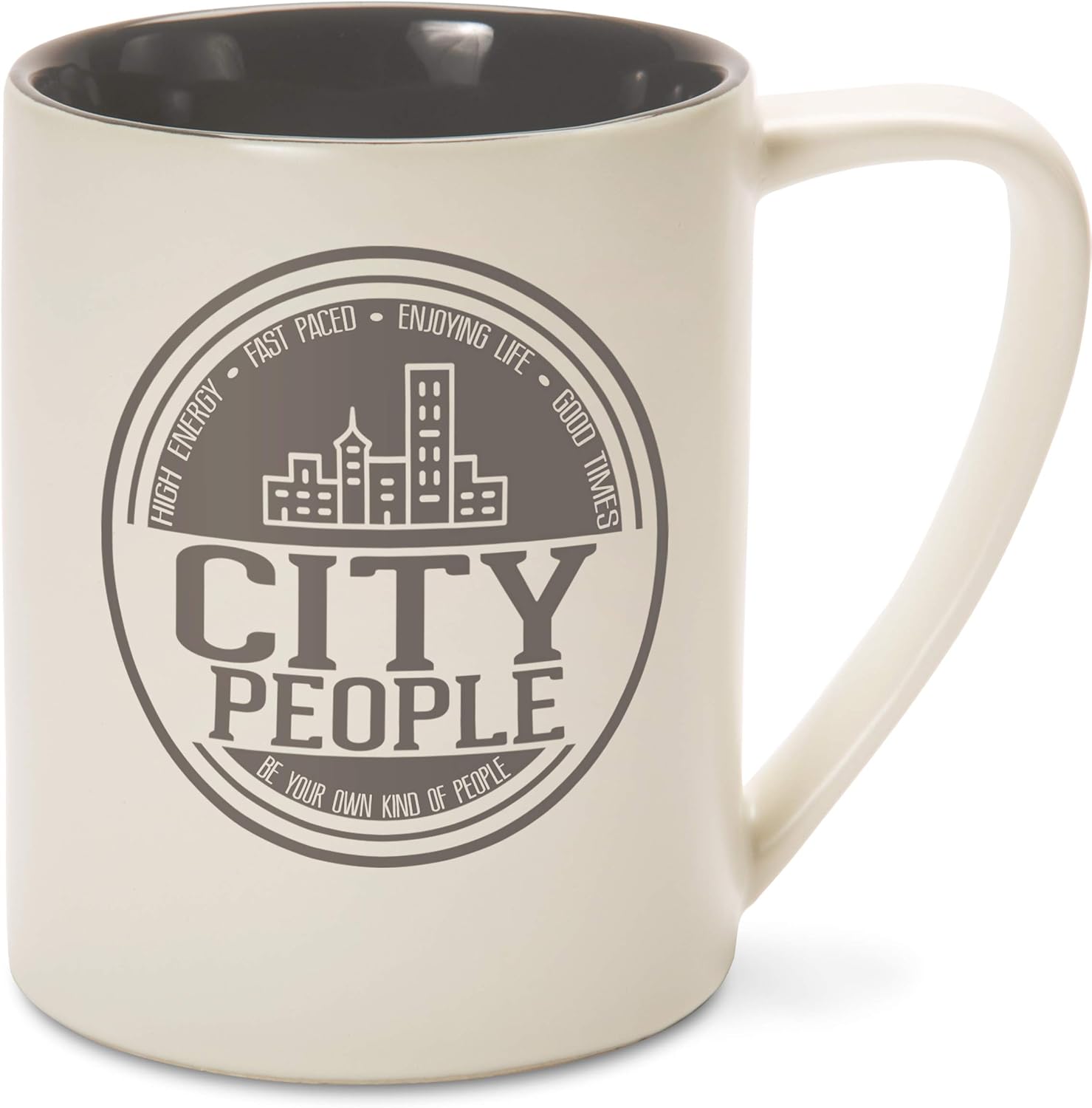 - IN-HOUSE DESIGN: "City People" decal, including "High Energy - Fast Paced - Enjoying Life - Good Times" text is printed on both sides of the mug, as are the accompanying skyline logo and "Be Your Own Kind Of People" text.