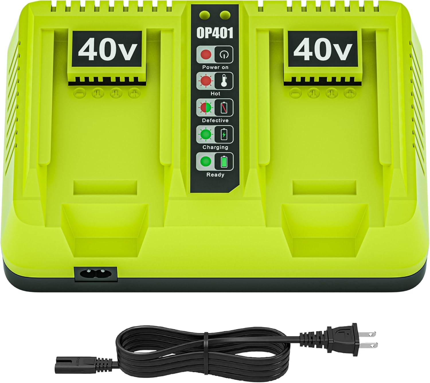 - ✅【DMMNS OP401S Dual Rapid Charger】DMMNS OP401S Dual Rapid Charger Replacement for Ryobi OP401 charger.It supports an input voltage range of AC100V-240V 50/60Hz and an output voltage of DC40V 2A. Each charging port equips an LED indicator, allowing for easy battery charging monitoring. This charger is a great alternative to the Ryobi 40V battery charger, as it charges batteries at a satisfactory speed and performs just as well as the OEM model.