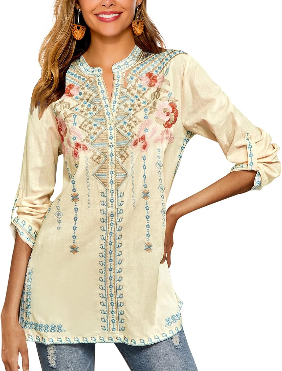 Higustar Mexican Embroidered Tops for Women Long Sleeve Shirts Bohemian Flower Peasant Tunics Clothing Boho Blouse