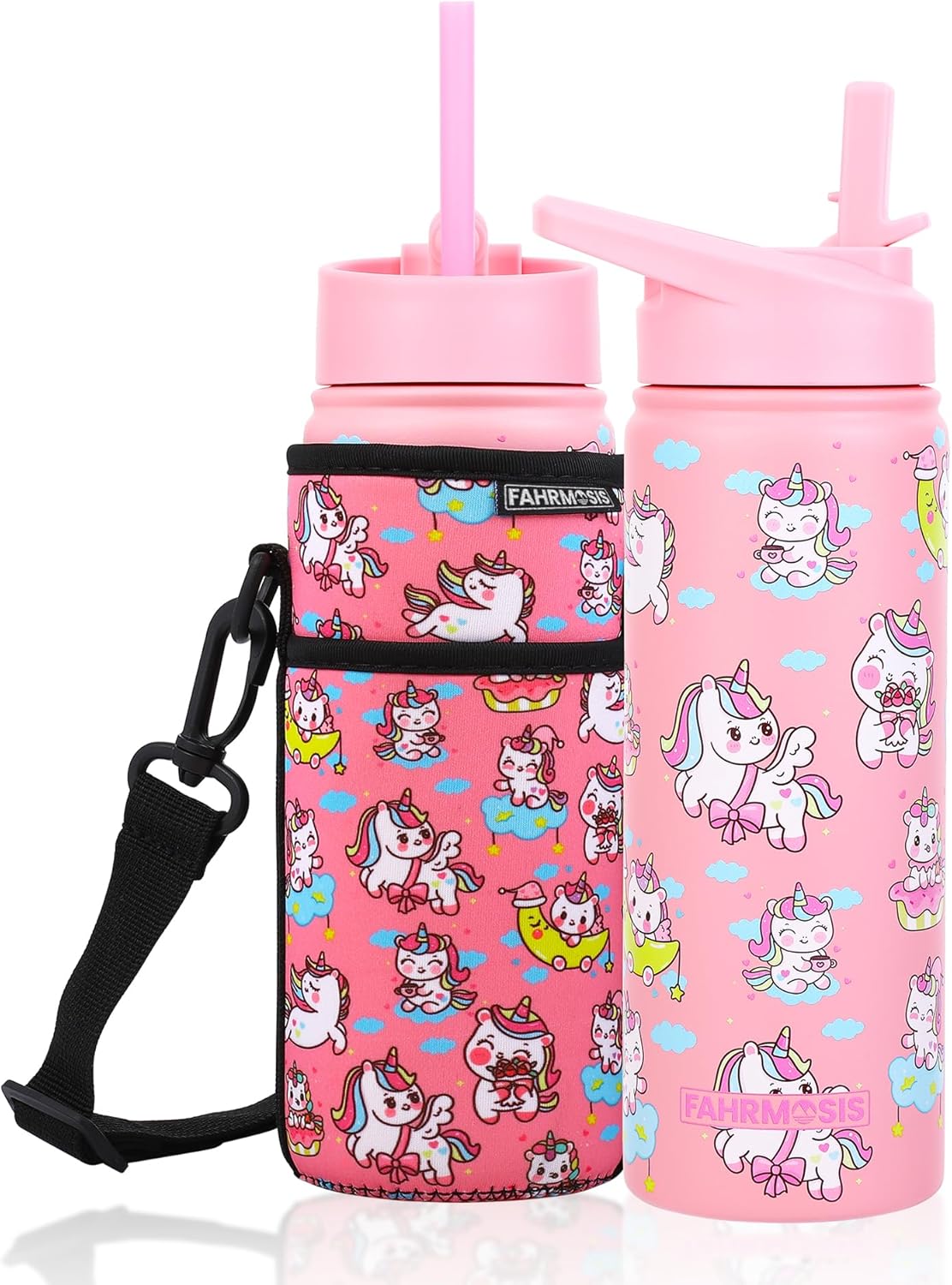 - Premium Quality & Insulation: FAHRMOSIS kids insulated water bottle with straw is crafted from 18/10 stainless steel, ensuring it is entirely safe and odorless. Our kids metal water bottle are constructed from BPA-free, safe material featuring a double insulated water bottle design that enables it to maintain cold drinks for over 24 hours and hot beverages for more than 12 hours, ensuring your child enjoys water at the perfect temperature.