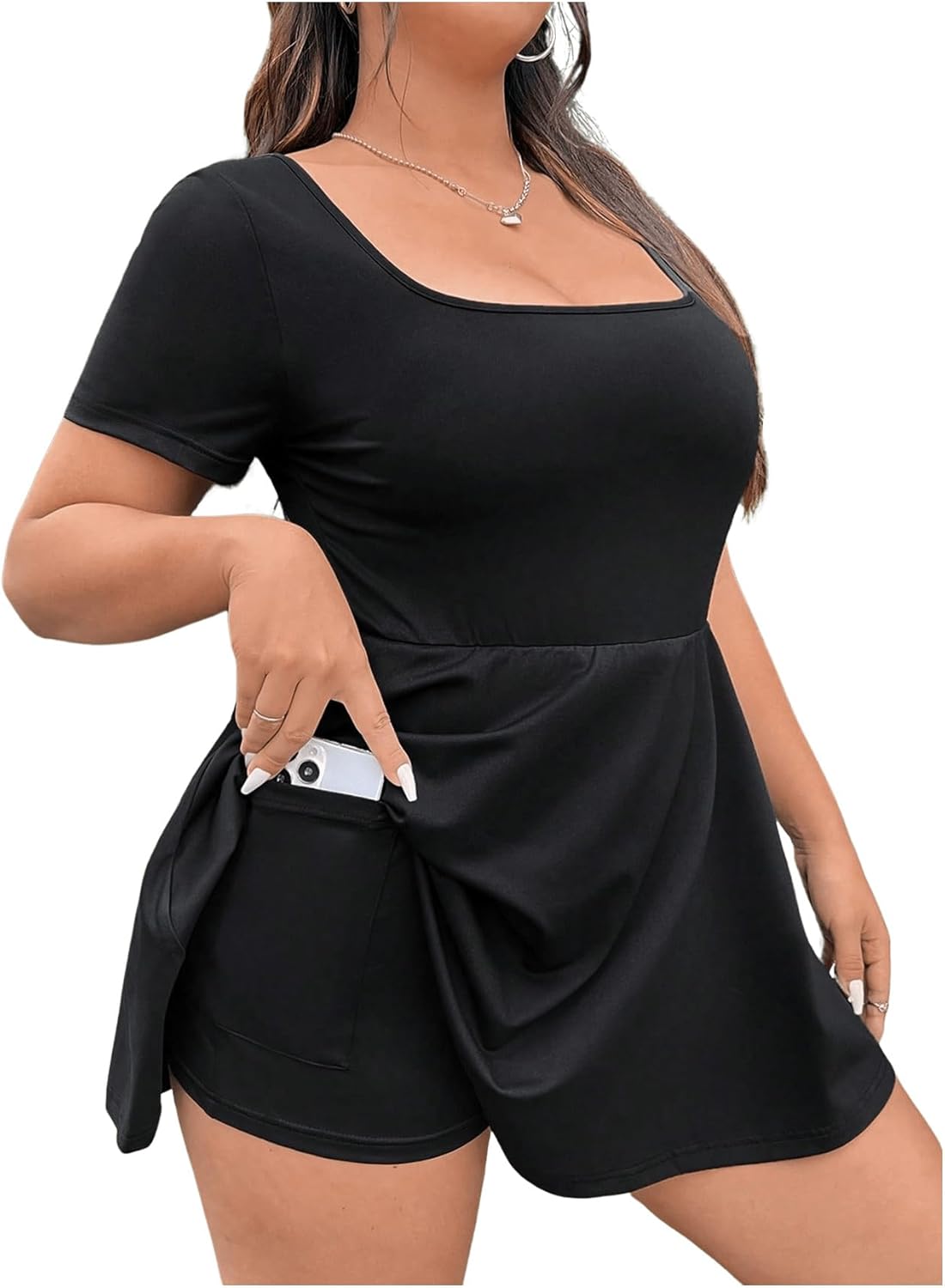 SOLY HUX Women's Plus Size Romper Square Neck Short Sleeve Ruffled Hem Short Jumpsuit with Pockets