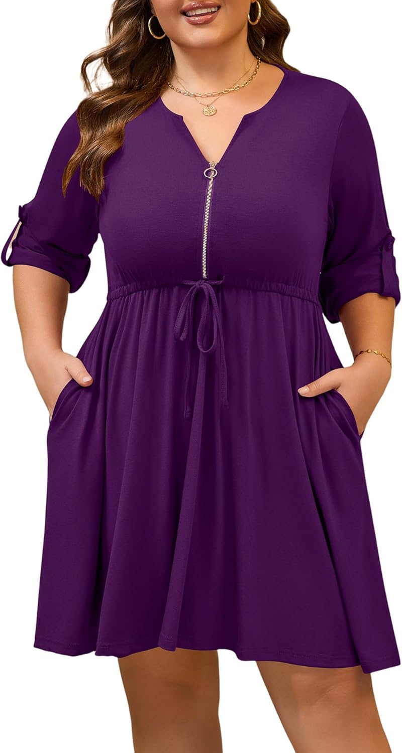 Womens Plus Size Dress Casual Roll up 3/4 Sleeves Zipper V Neck Tie Waist Flowy Loose Dresses with 2 Pockets