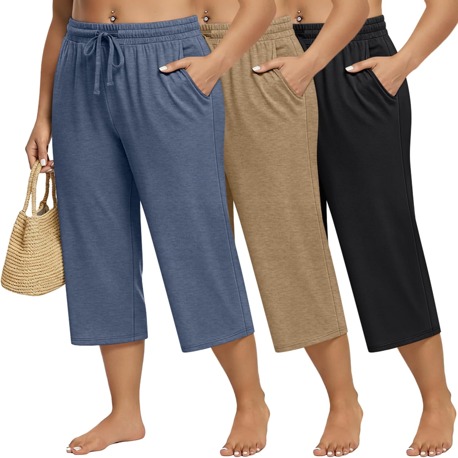 Huukeay 3 Pack Women's Plus Size Capris Wide Leg Yoga Capri Sweatpants Drawstring Loose Fit Summer Cropped Pants with Pockets