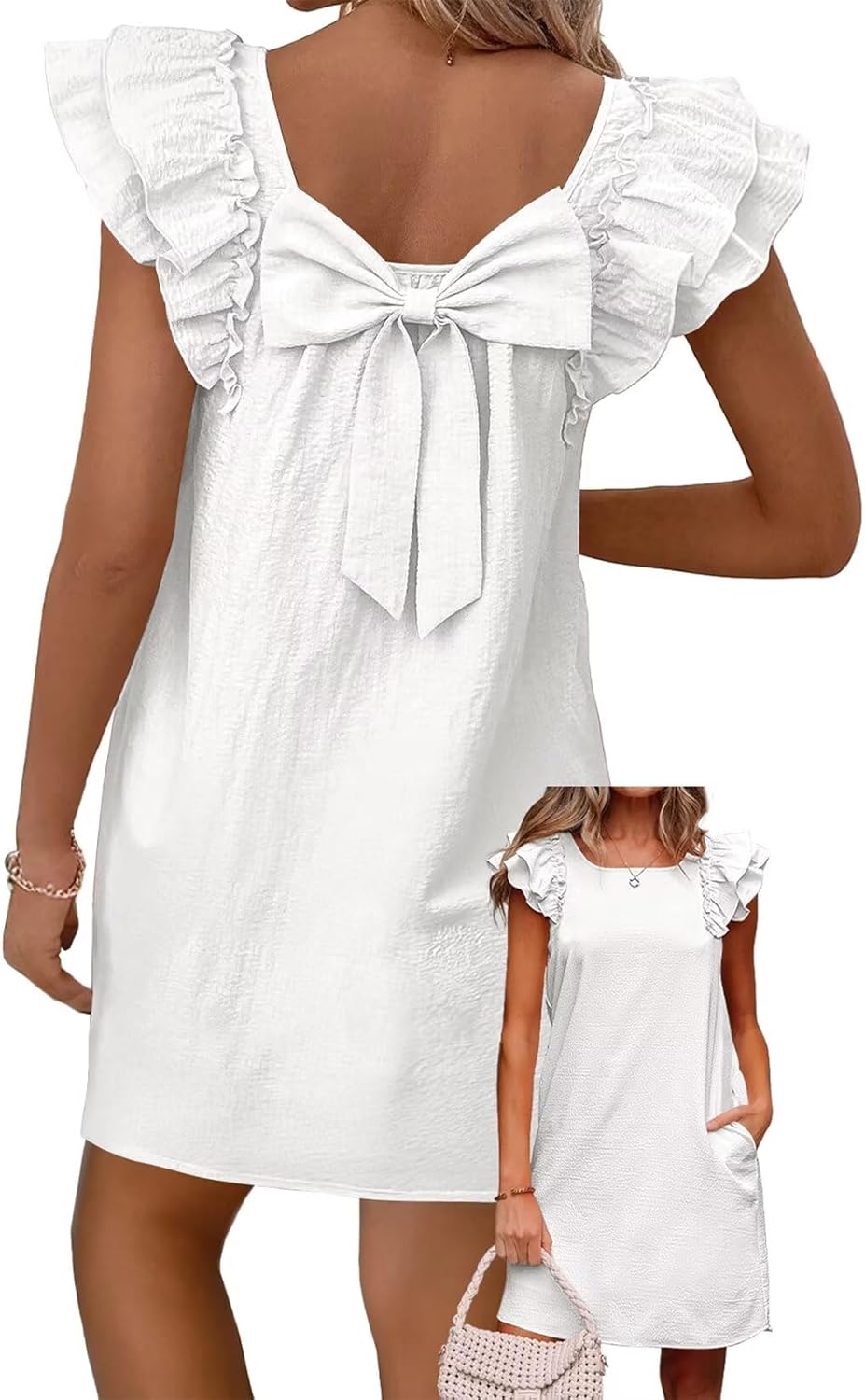 Womens Summer Dresses Bow Tie Back Sundresses for Women Ruffle Short Sleeve Dress Casual Cute Sundress with Pockets