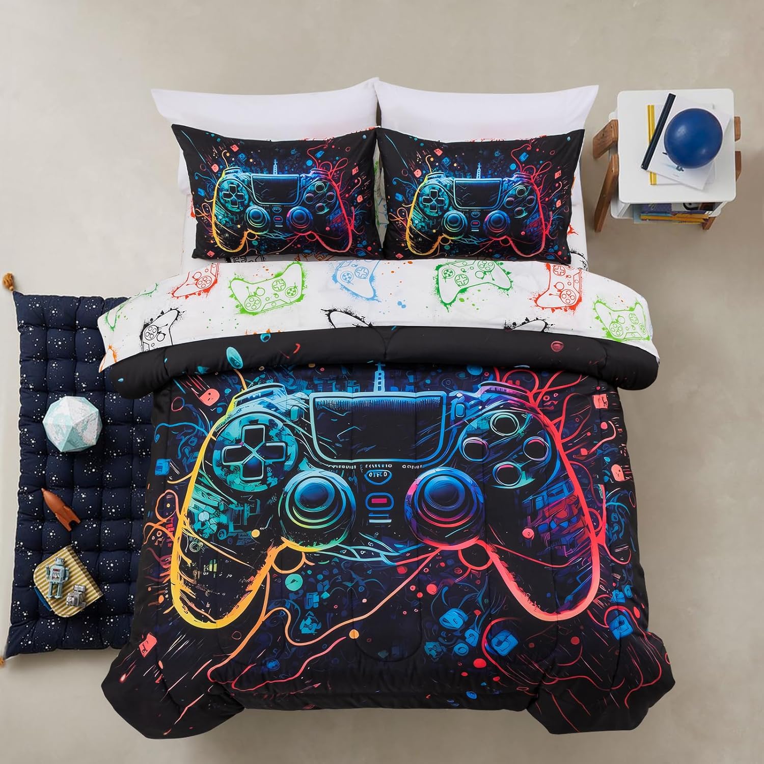 - 【3D Design】Gaming Comforter Set is designed to be fun and modern, with colorful 3D visual wall as the background coordinating with adorable pillowcases for a complete look.Double sided printing design.The back of the quilt prints also game contoller.Kids will fall in love with this bedding at a glance.