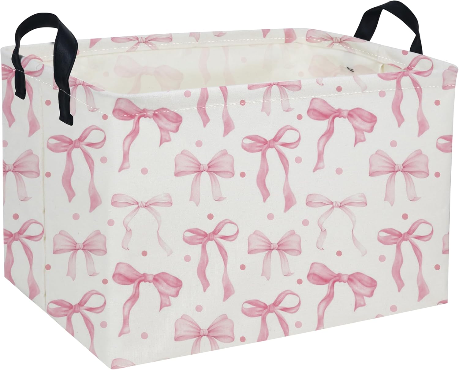 Kids Basket Pink Baskets Girls Basket Rectangular Cute Storage Bin for Room Decor(Pink bownot)