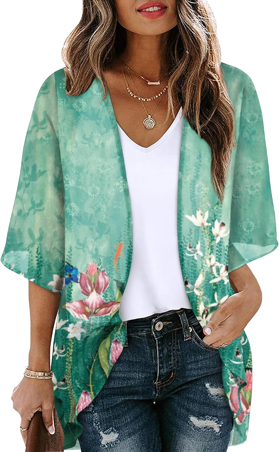 OFEEFAN Beach Cover Ups for Women 3/4 Length Sleeve Womens Tops Summer Cardigan Casual Blouses Loose Fit