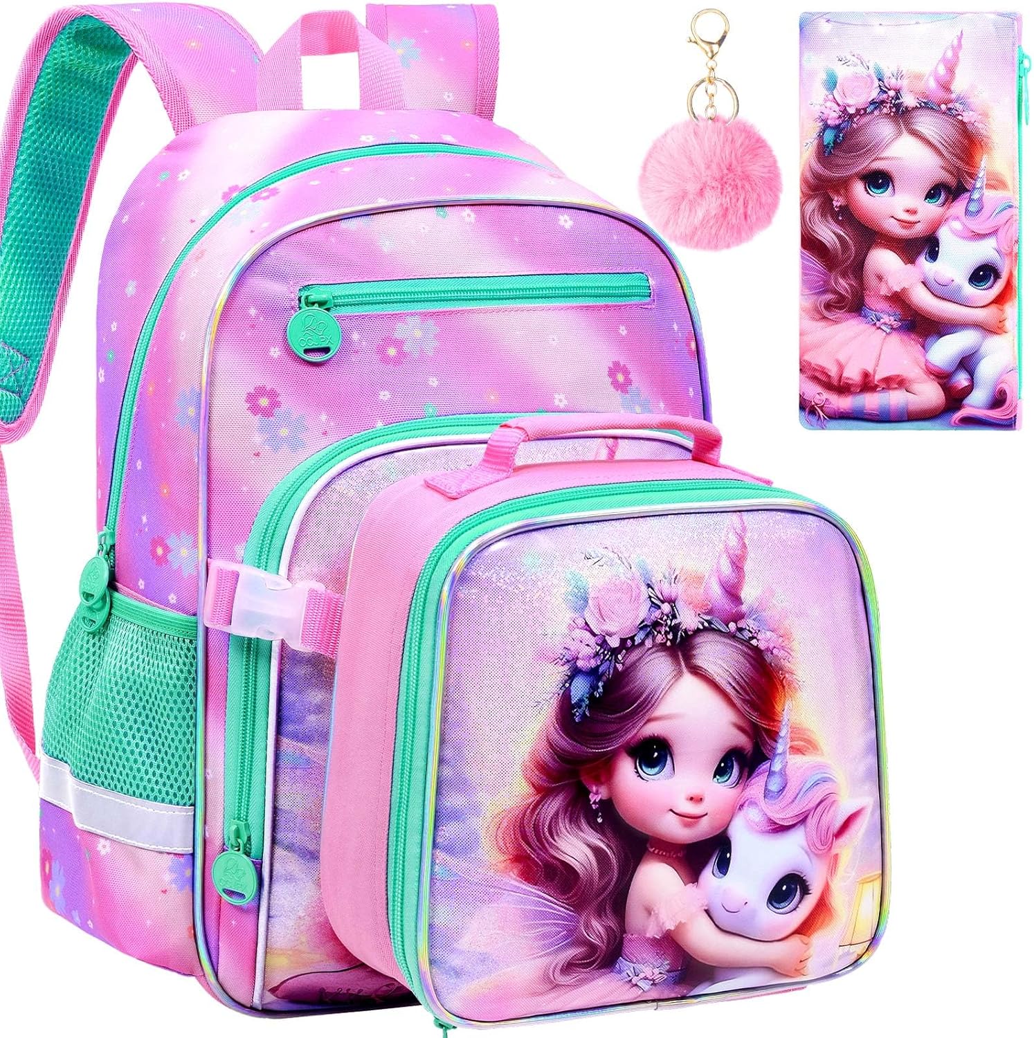 3PCS Girls Backpack, 16" Sequin Prechool Elementary Bookbag and Lunch Box