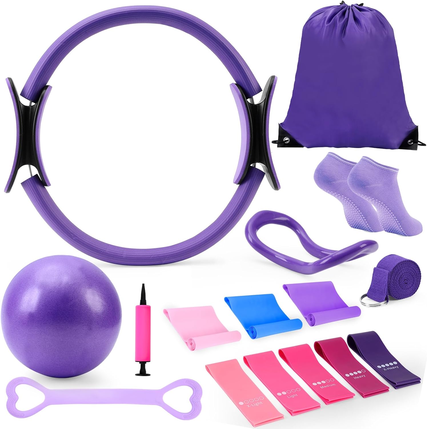 1 Arm Stretcher; 1 Pair Of Non-Slip Pilates Socks;, 1 Figure-8 Resistance Band; 1 Cotton Yoga Strap;, 1 Pilates Ring; 1 Yoga Ball;, 1 Pump; 1 Storage Bag, 5 Colorful Resistance Bands; 3 Elastic Bands;