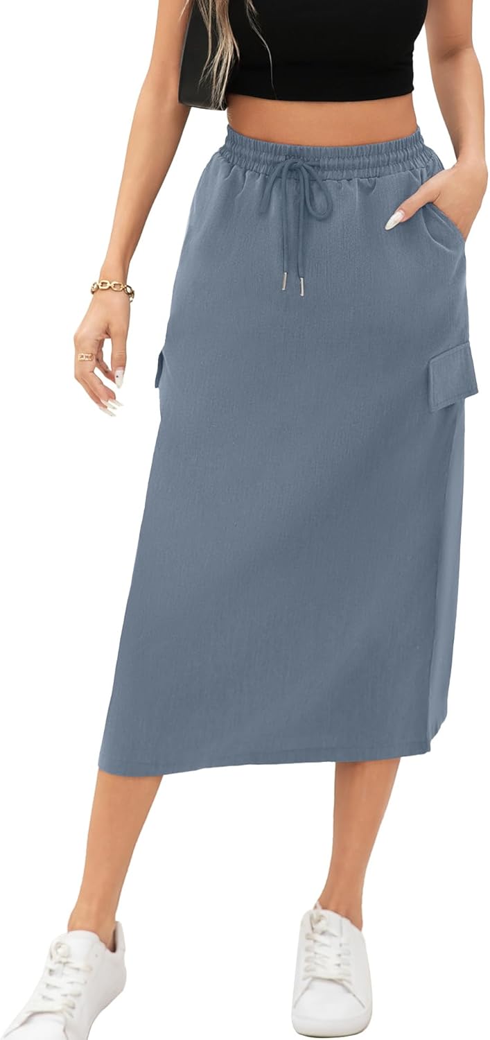Women's Midi Cargo Skirt High Waist Drawstring Summer Slit Dressy Casual Skirts with Pockets