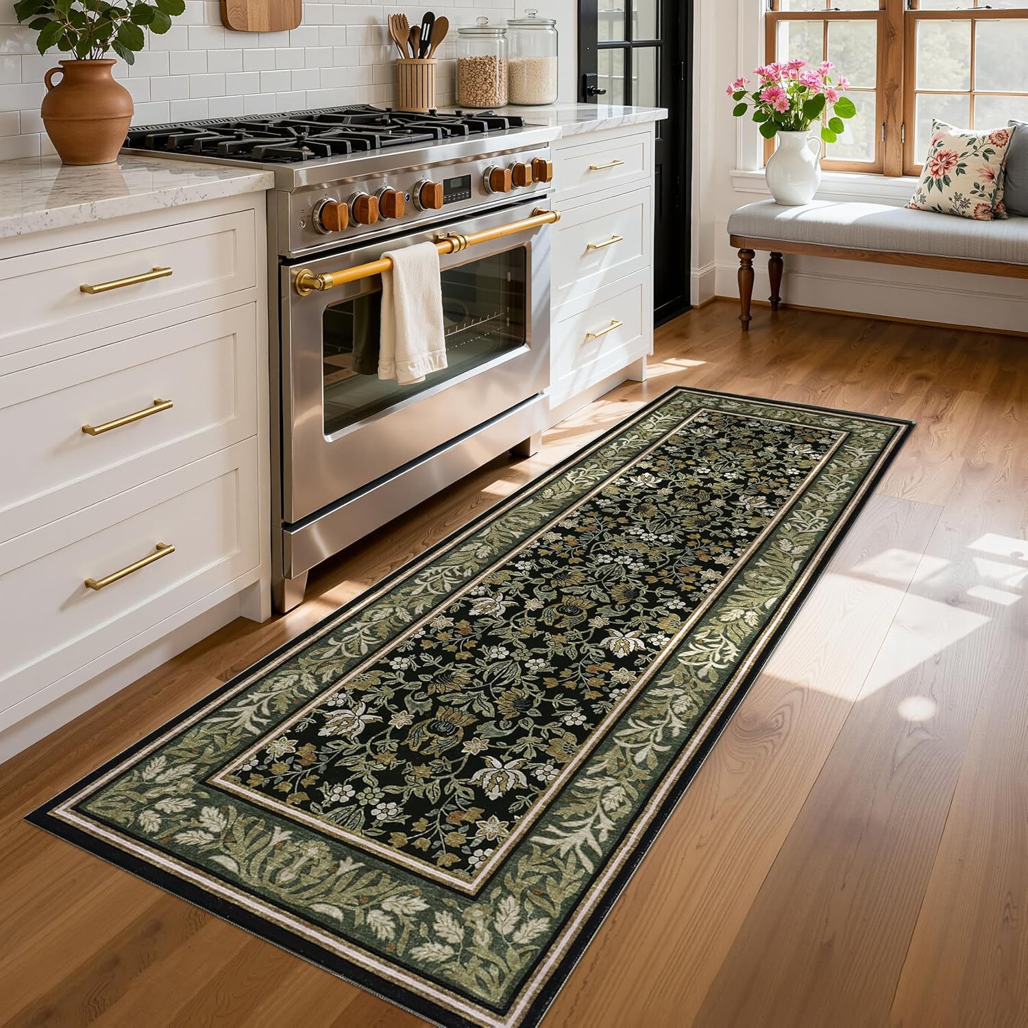 GarveeHome Runner Rugs 2x6 Kitchen Runner Rug Non Slip Washable Runners for Hallways, Boho Vintage Rugs with Rubber Backing Low-Pile Indoor Long Carpet for Entryway Bedroom Green Black