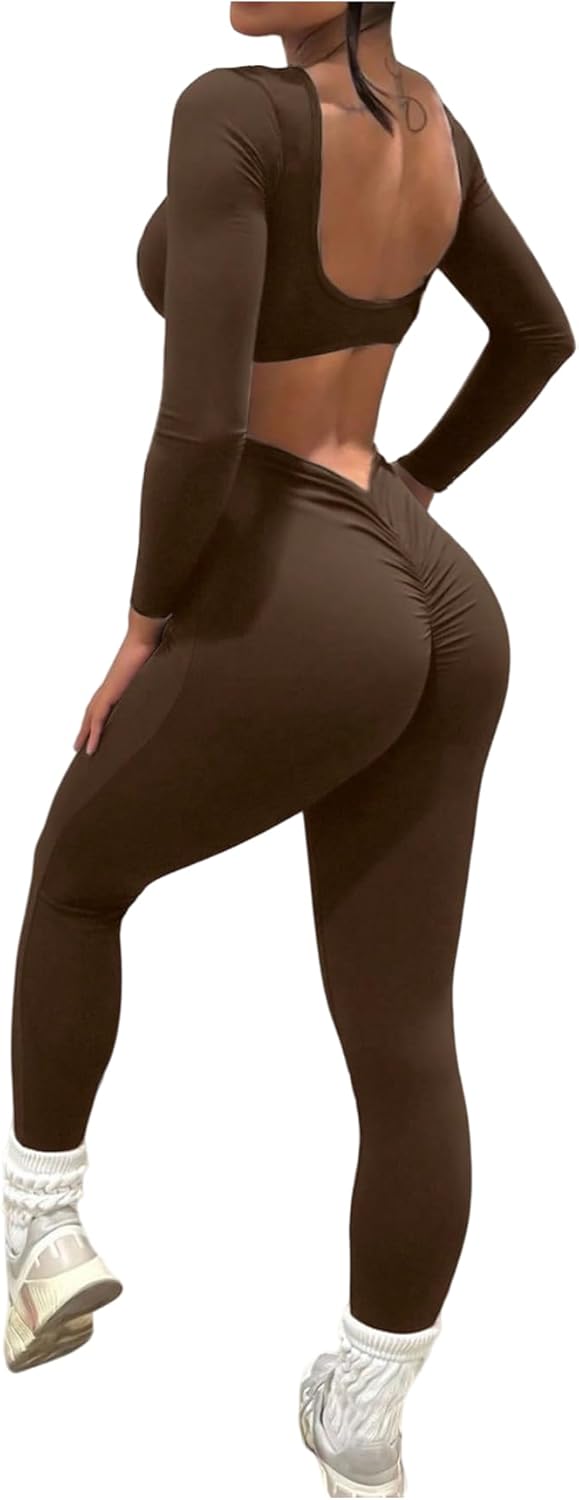 WDIRARA Women's Backless Workout Jumpsuit Long Sleeve Scrunch One Piece Yoga Unitard Pants Romper