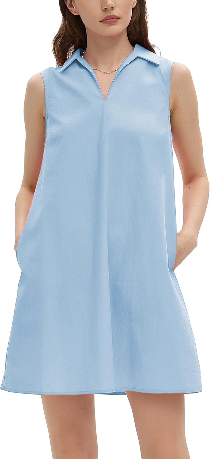 Womens Sleeveless Shirt Dress V Neck Collared Shift Flowy Mini Tank Dresses with Pockets