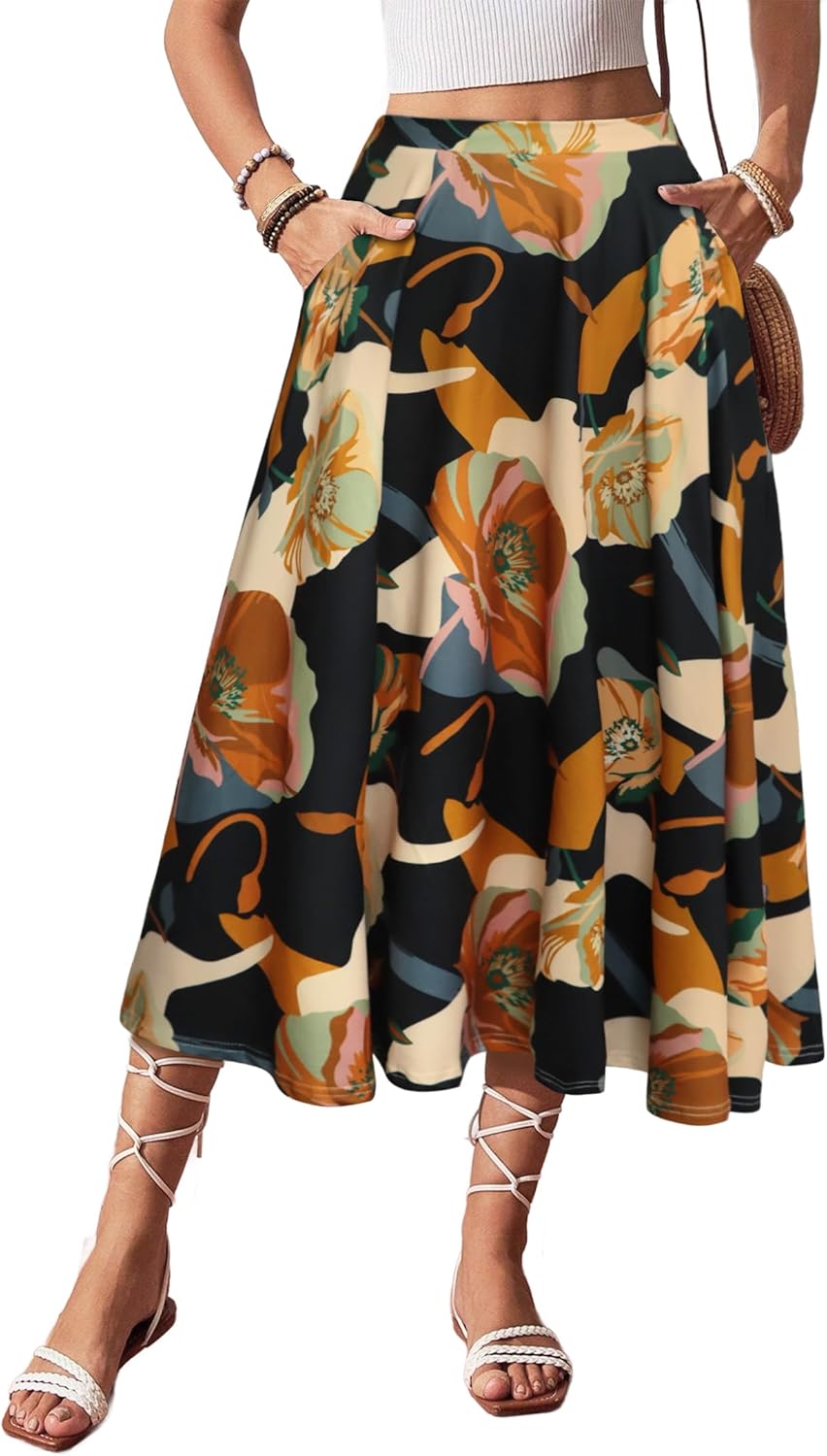 Women's Elastic Casual Midi Skirt for Women 2025 Flowy Swing Pleated Boho Long Skirt Floral-24 Large