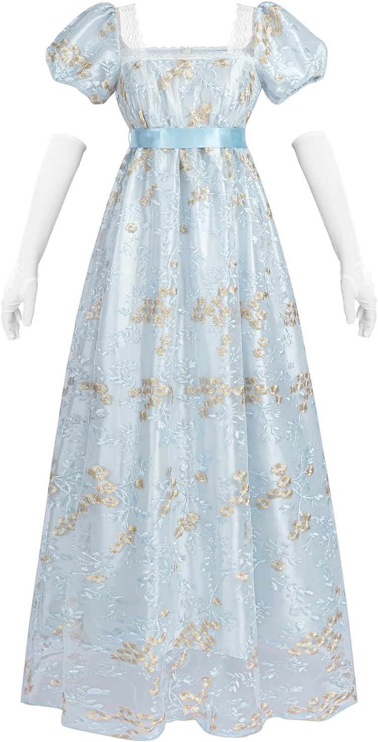 LTAKK Regency Dress Women Regency Costume Empire Waist Tea Party Embroidery Victorian Gown with Sash and Gloves