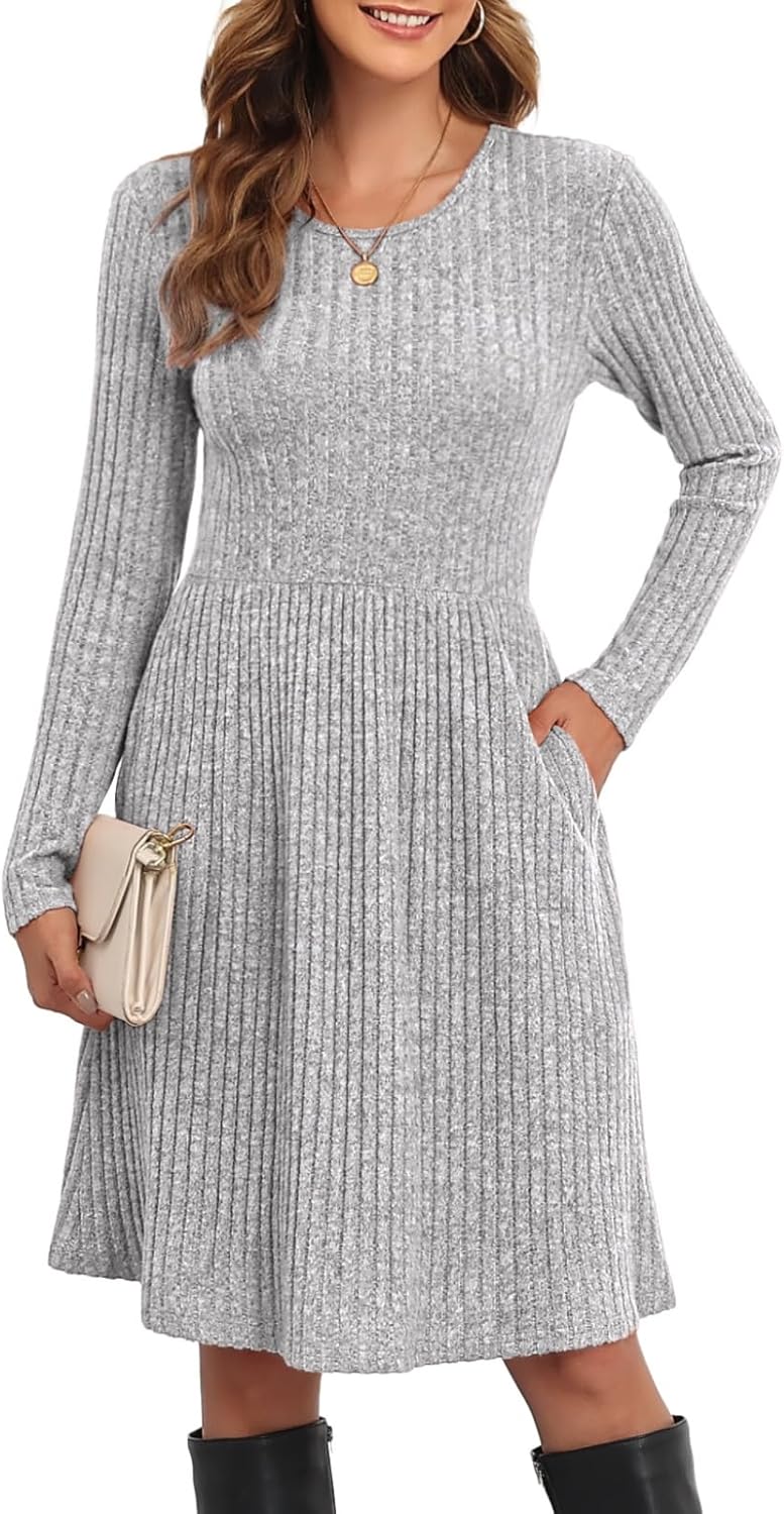 Women's Knit Textured Sweater Dresses Long Sleeve Loose Casual Pleated Fall Dress with Pockets,Grey, L