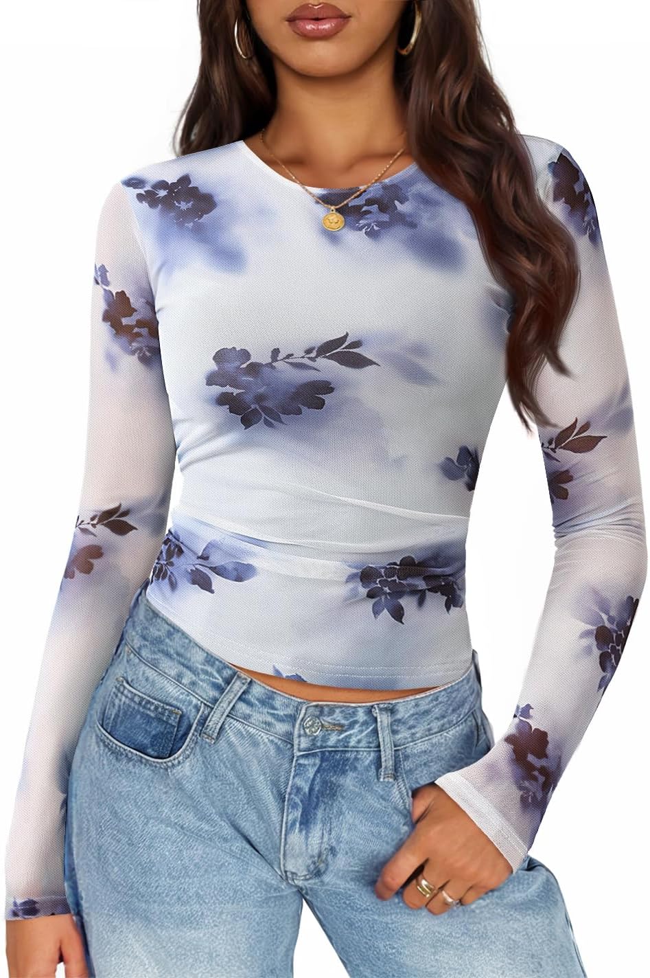 ZESICA Womens 2026 Spring Floral Mesh Going Out Tops Long Sleeve Crewneck Slim Fit Ruched Y2k Shirt Beach Vacation Outfit