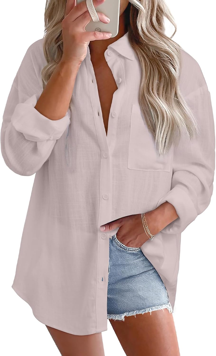 Astylish Women 2026 Loose Fit Tops Cotton Linen Button Down Shirts Collared Roll Up Long Sleeve V Neck Blouses